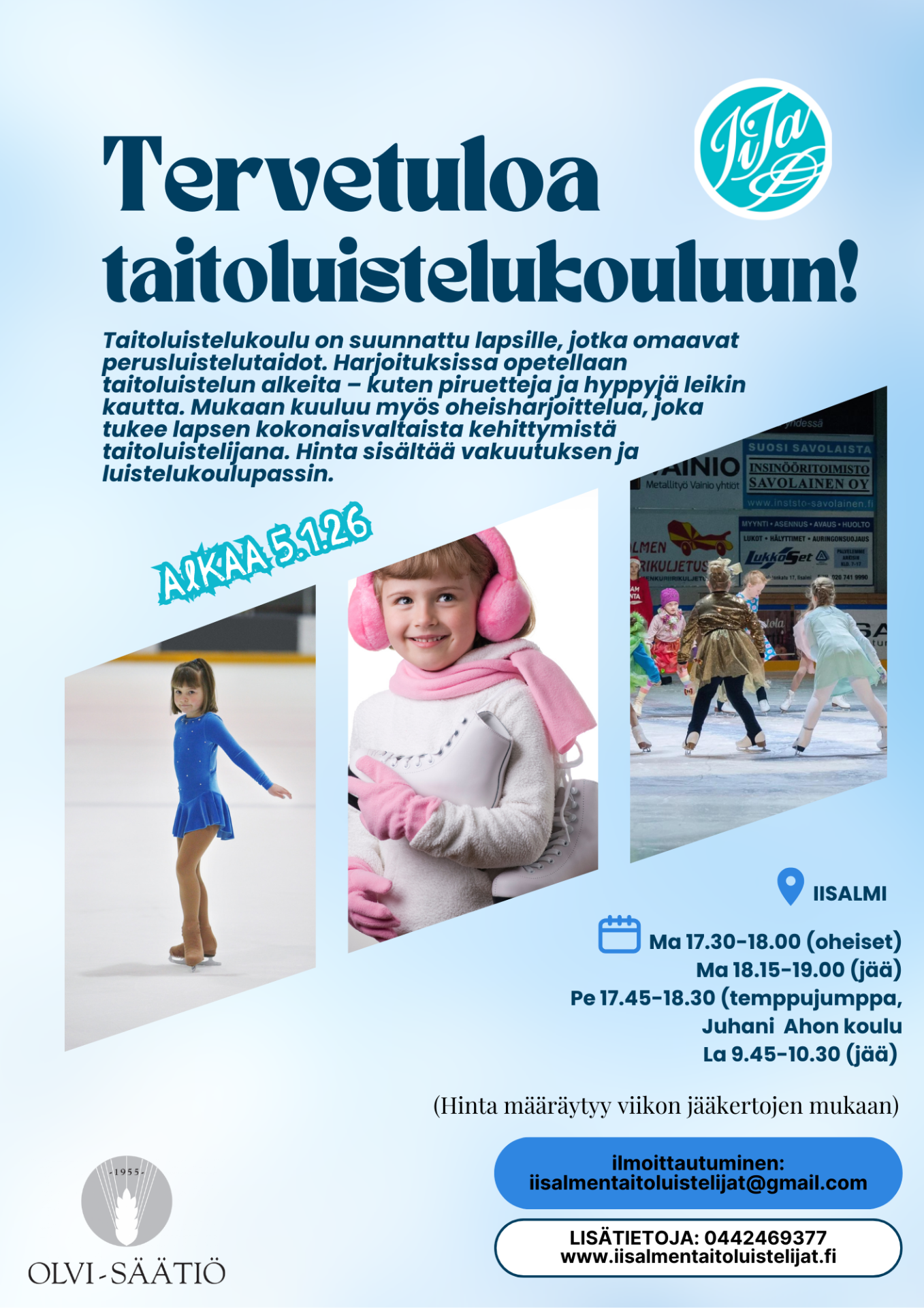 Tervetuloa mukaan TAITOLUISTELUKOULUUN. Ryhmä on tarkoitettu 4-8 vuotiaille luistelusta kiinnostuville lapsille, jotka hallitsevat jo jonkin verran perusluistelua ja haluavat oppia lisää.